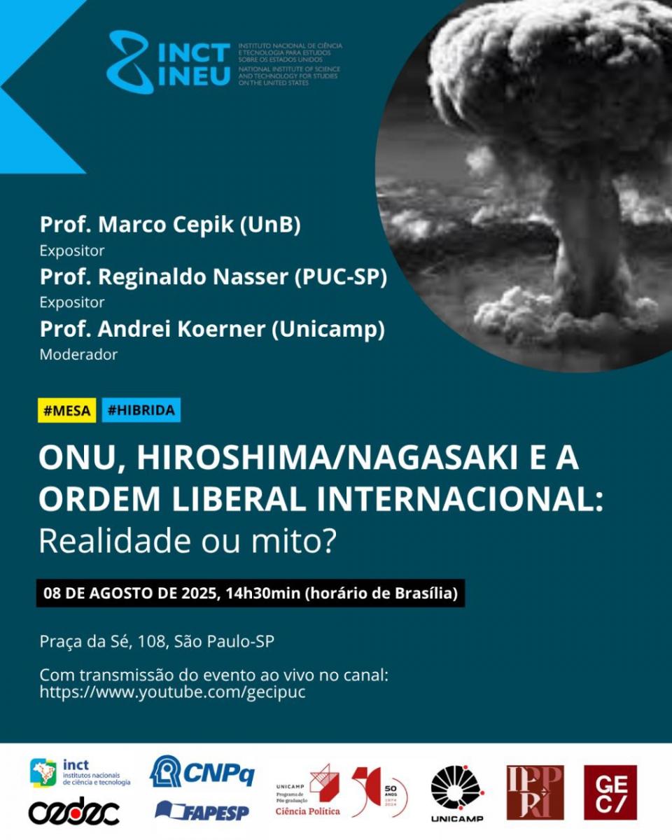 O Grupo de Estudos sobre Conflitos Internacionais da PUC-SP (GECI) realiza o debate ONU, Hiroshima/Nagasaki e a Ordem Liberal Internacional: Realidade ou Mito?. A atividade acontece dia 8/8, às 14h30, na sede do Pós em Relações Internacionais San Tiago Dantas – Praça da Sé, 108 – Auditório, 3º andar.