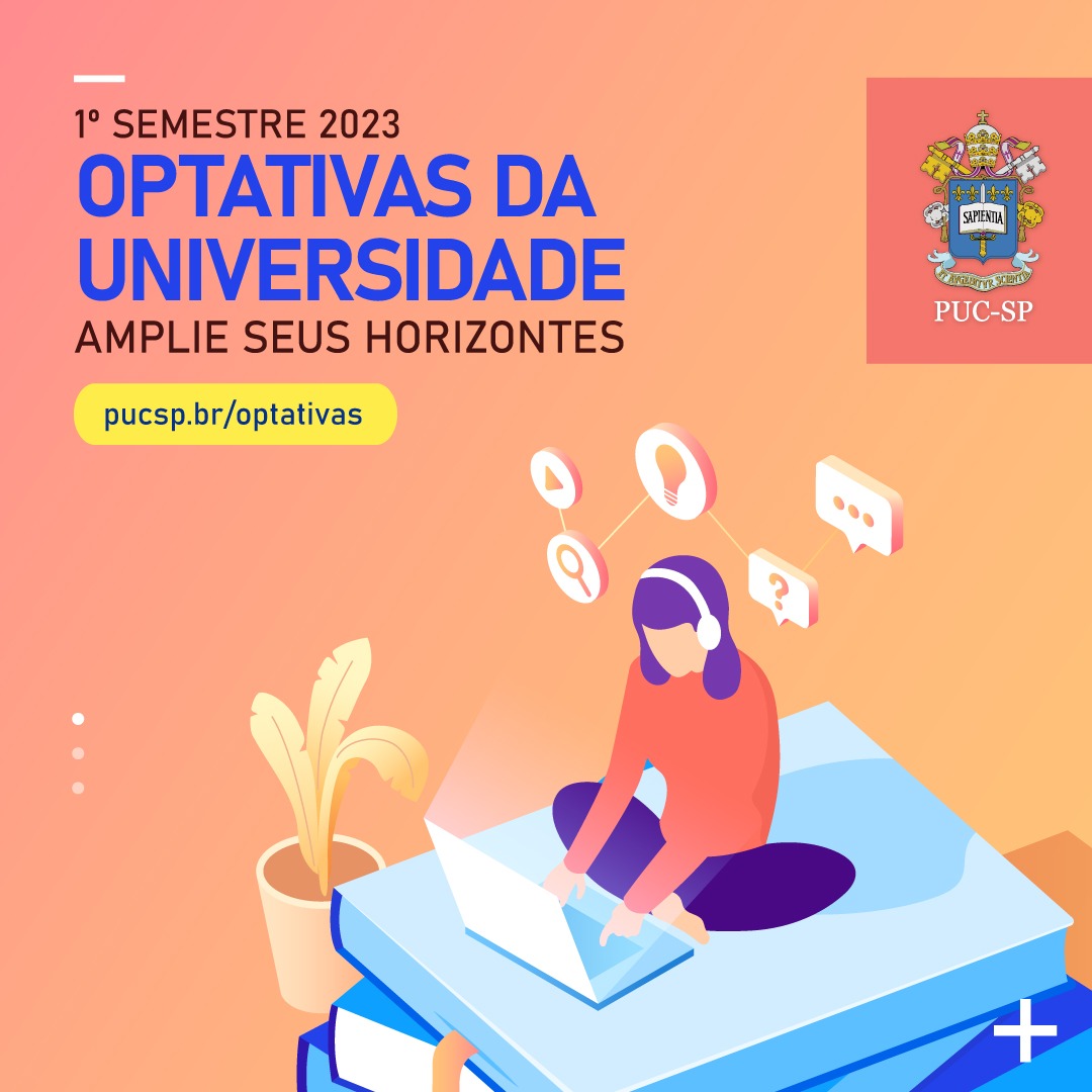 De 11 a 24/11, estão abertas as inscrições para alunos de graduação das Optativas da Universidade - 1º Semestre de 2023. Elas são ofertadas às quintas-feiras, em turnos e horários próprios, que podem ser consultados neste link.