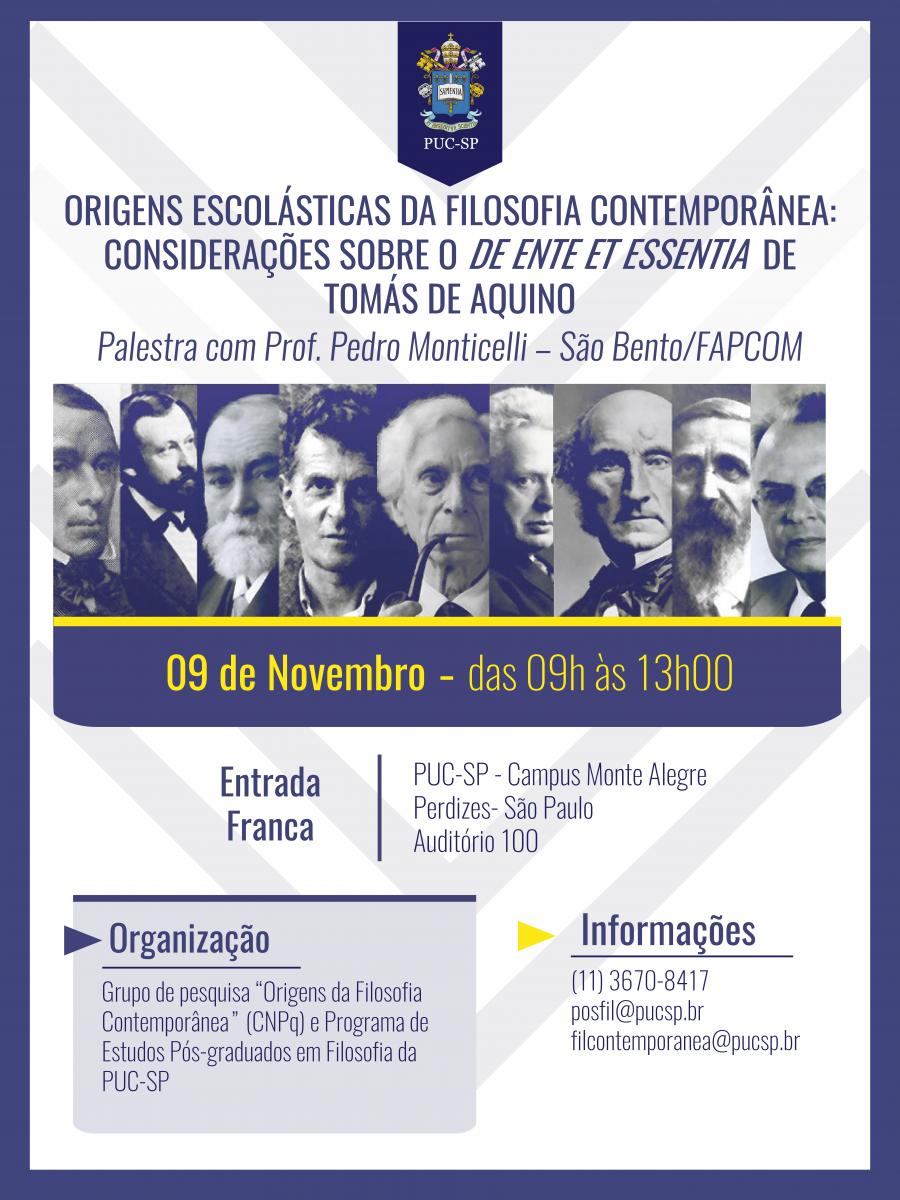 O prof. Pedro Monticelli (São Bento/FAPCOM) realiza a palestra Origens escolástica da filosofia contemporânea: considerações sobre o de ente et essentia de Tomás de Aquino, dia 9/11, às 9h.