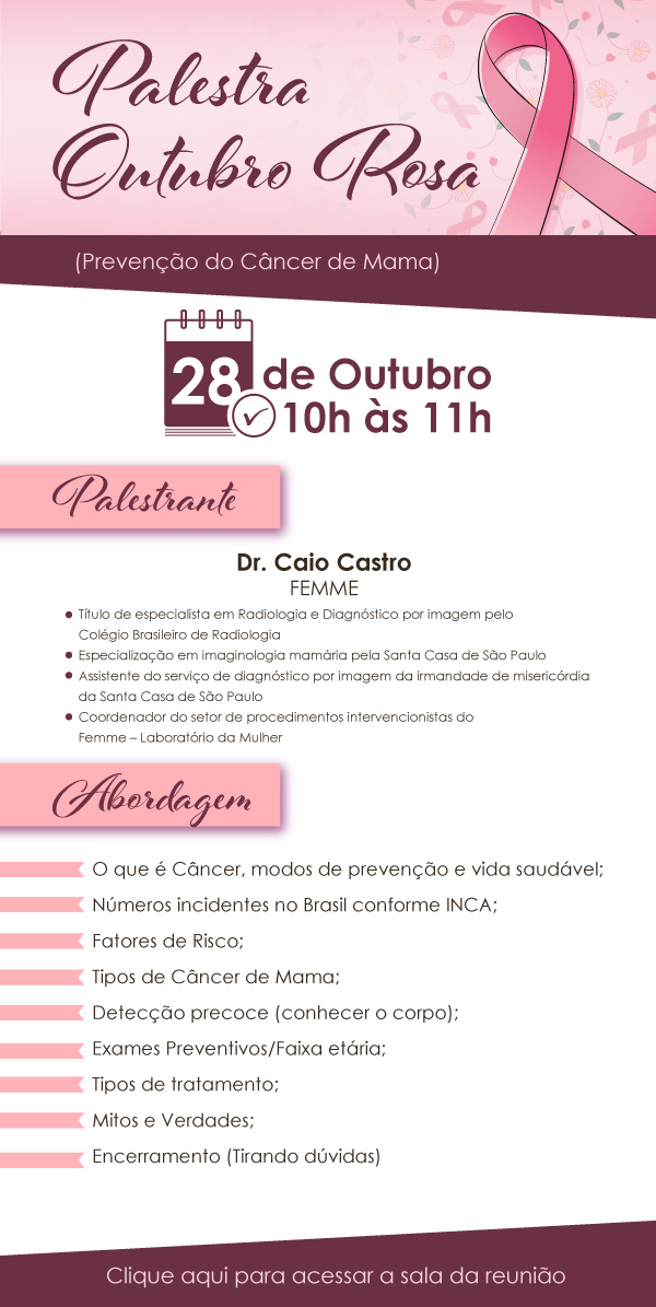 No dia 28/10, às 10h, será realizada a palestra Outubro Rosa, prevenção ao câncer de mama. O evento é online e conta com a participação do especialista em radiologia e diagnóstico por imagem Caio Castro.