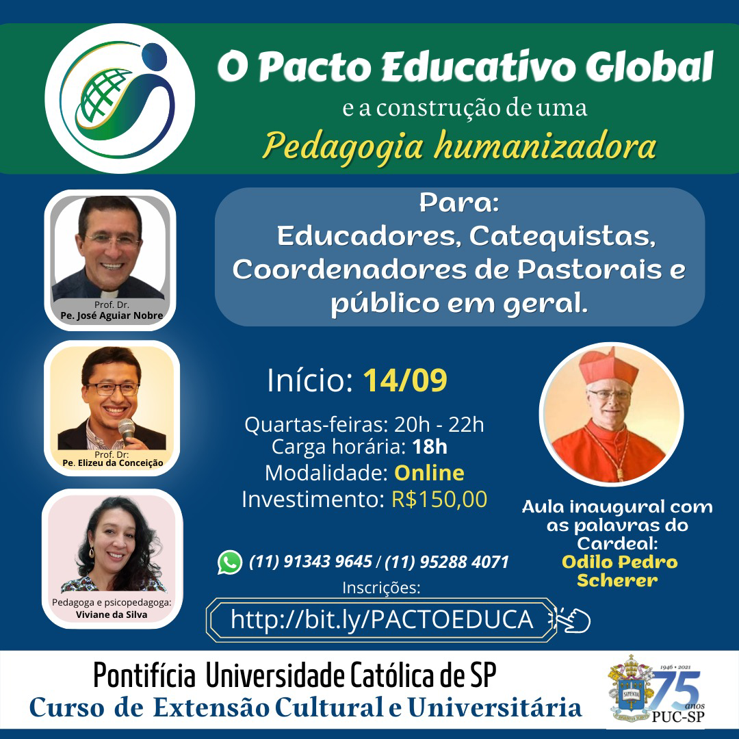 No dia 14/9, às 20h, acontece a aula inaugural do curso "O Pacto Educativo Global e a Construção de uma Pedagogia Humanizadora", com a presença do Cardeal Odilo Pedro Scherer, Arcebispo Metropolitano de São Paulo e grão-chanceler da PUC-SP.