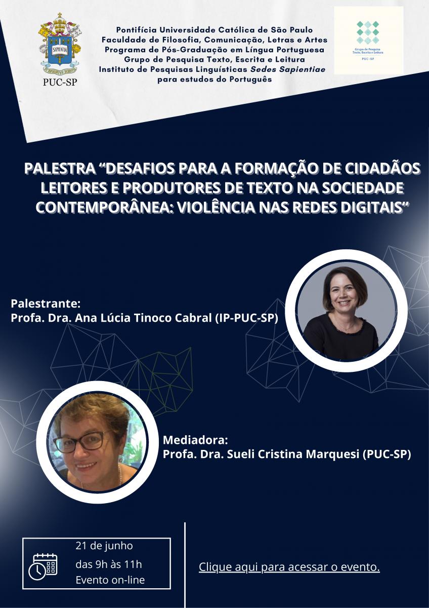 O Grupo de Pesquisa Texto, Escrita e Leitura (Programa de Pós-Graduação em Língua Portuguesa) realiza a palestra online Desafios para a formação de cidadãos leitores e produtores de texto na sociedade contemporâneas: violência nas redes digitais. A atividade acontece dia 21/6, das 9 às 11h (clique aqui para acessar).