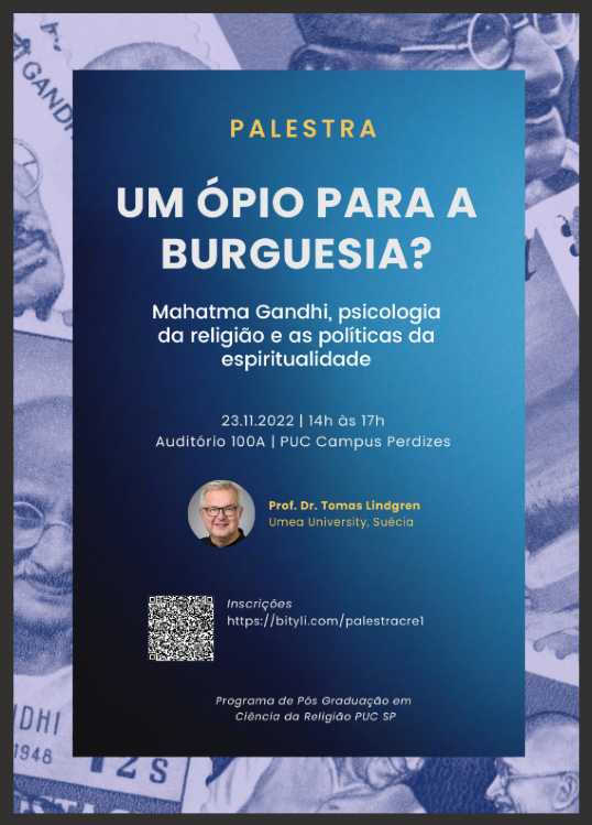 Dia 23/11, das 13 às 18h, acontece a palestra Um ópio para a burguesia? Mahatma Gandhi, psicologia da religião e as políticas da espiritualidade, com Tomas Lindgren (Ümea University, Suécia).