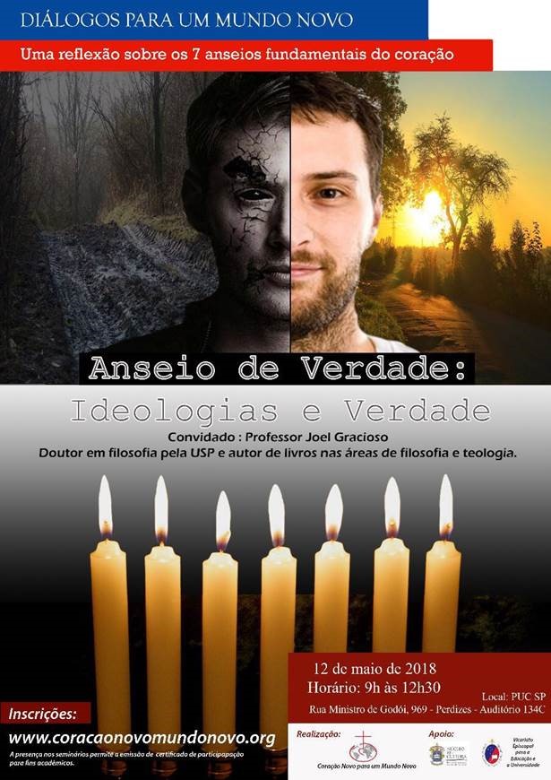 Dia 12/5, às 9h, acontece a palestra Diálogos para um Mundo Novo – Anseio de Verdade, com o prof. Joel Gracioso (Doutor em Filosofia na USP), que aborda uma reflexão sobre os sete anseios fundamentais do coração. O evento será no campus Monte Alegre, auditório 134 C (1º andar, prédio novo). Para mais informações, ligue: 3670-8486.