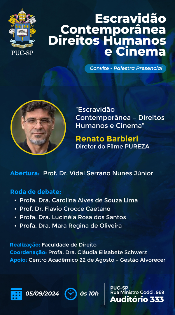 A Faculdade de Direito da PUC-SP promove a palestra Escravidão Contemporânea Direitos humanos e Cinema. A atividade acontece de forma presencial no dia 5/9, às 10h, no auditório 333 do campus Monte Alegre.