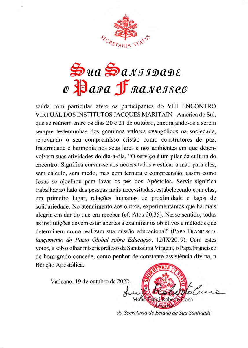 O papa Francisco enviou Bênção Apostólica ao VIII Encontro dos Institutos Jacques Maritain da América do Sul (Argentina, Brasil e Chile), que contou com a participação de diversos integrantes da PUC-SP.