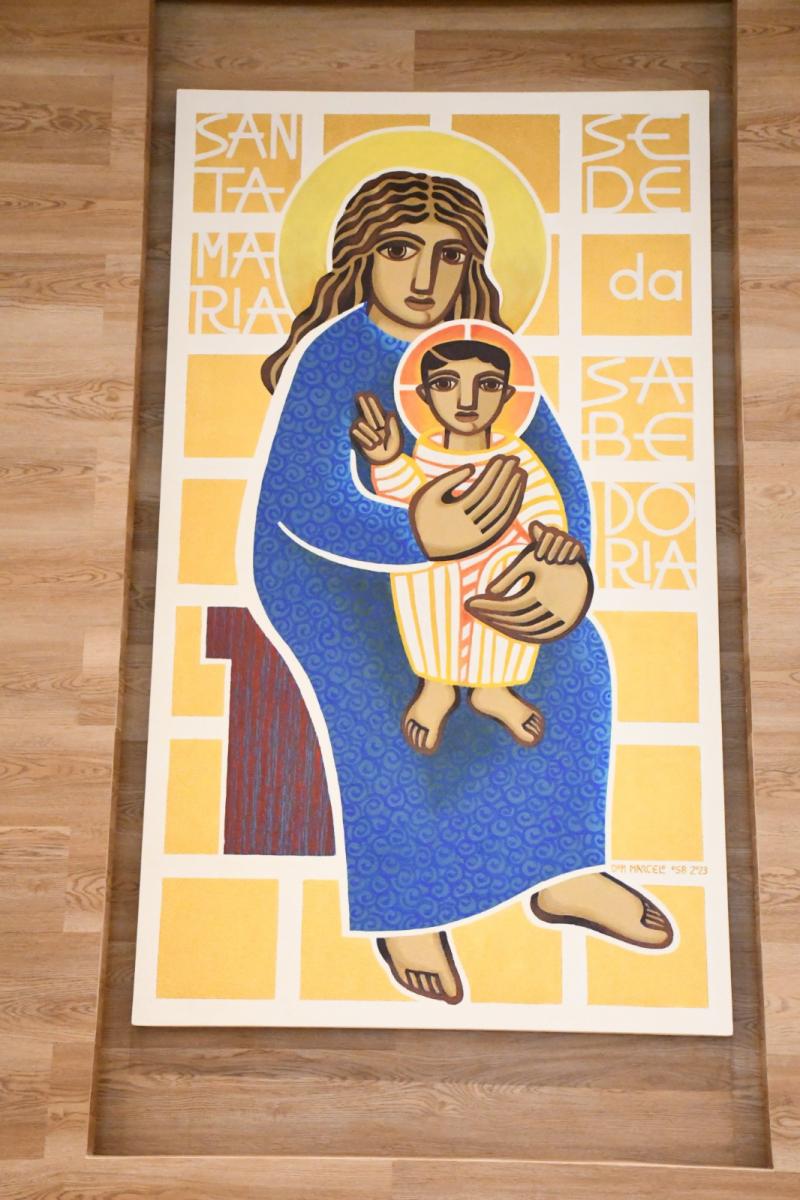 No local, se destaca um painel de autoria de Dom Marcelo Molinero, monge beneditino, sacerdote, artista plástico, liturgista e educador. A capela foi concebida nesse prédio, que já foi sede do Instituto Sedes Sapientiae, pertencente às irmãs cônegas de Santo Agostinho. A figura de Nossa Senhora representa a sede da sabedoria, pois se Jesus é o verbo de Deus que se fez presente, Maria foi o lugar onde esta sabedoria foi acolhida.
