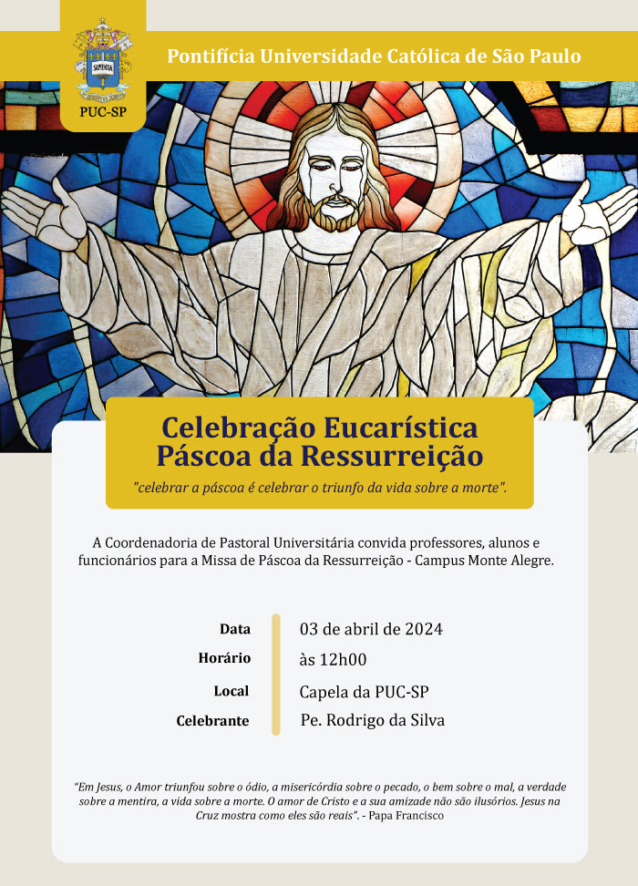 A atividade acontece no dia 3/4, às 12h, na capela da PUC-SP, no campus Monte Alegre. O celebrante será Pe. Rodrigo da Silva.