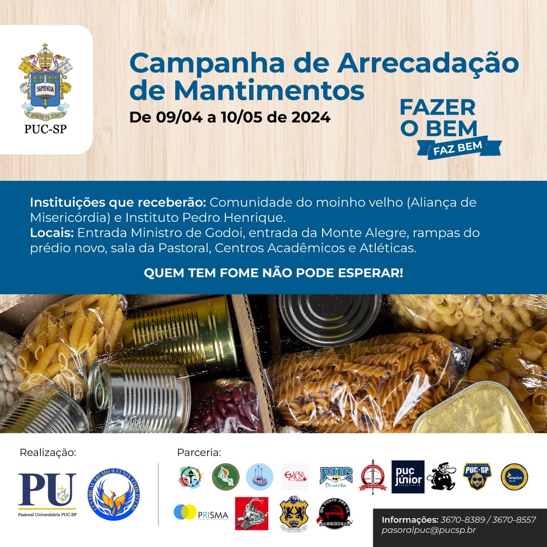 Atividade acontece até 10/5. Os alimentos não perecíveis podem ser depositados nas instituições: Comunidade do Moinho Velho (Aliança de Misericórdia) e Instituto Pedro Henrique. Na PUC-SP, os alimentos podem ser depositados nas caixas localizadas na entrada do campus Monte Alegre pela rua Ministro de Godói, entrada pela rua Monte Alegre, rampas do Prédio Novo, Centros Acadêmicos e Atléticas.