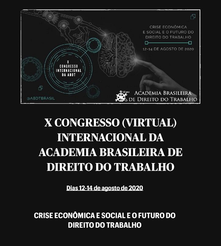 De 12 a 14/8, acontece o X Congresso Virtual Internacional da Academia Brasileira de Direito do Trabalho, com o tema "Crise Econômica e Social e o Futuro do Direito do Trabalho". O evento reúne palestrantes nacionais e internacionais, entre eles o prof. Pedro Paulo Teixeira Manus, diretor da Faculdade de Direito da PUC-SP e vice-presidente da ABDT. Confira a programação do evento em: www.andtbrasil.org.br.