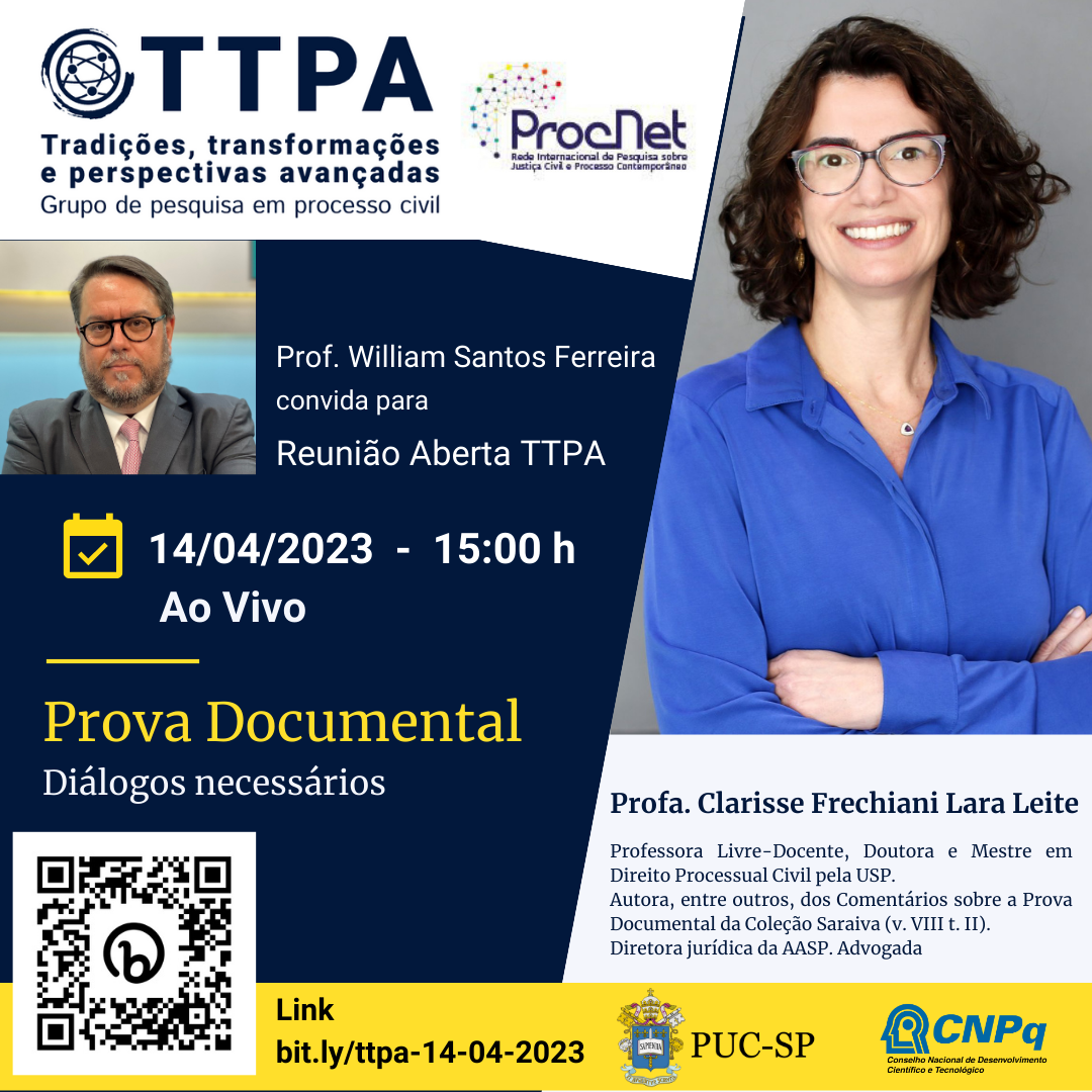 Líder do Grupo de Pesquisas da PUC-SP, “Processo Civil: Tradições, transformações e perspectivas avançadas - TTPA”, o prof. William Santos Ferreira recebe em reunião aberta a profa. Clarisse Frechiani Lara Leite (USP). O tema do encontro será Prova Documental – Diálogos Necessários.