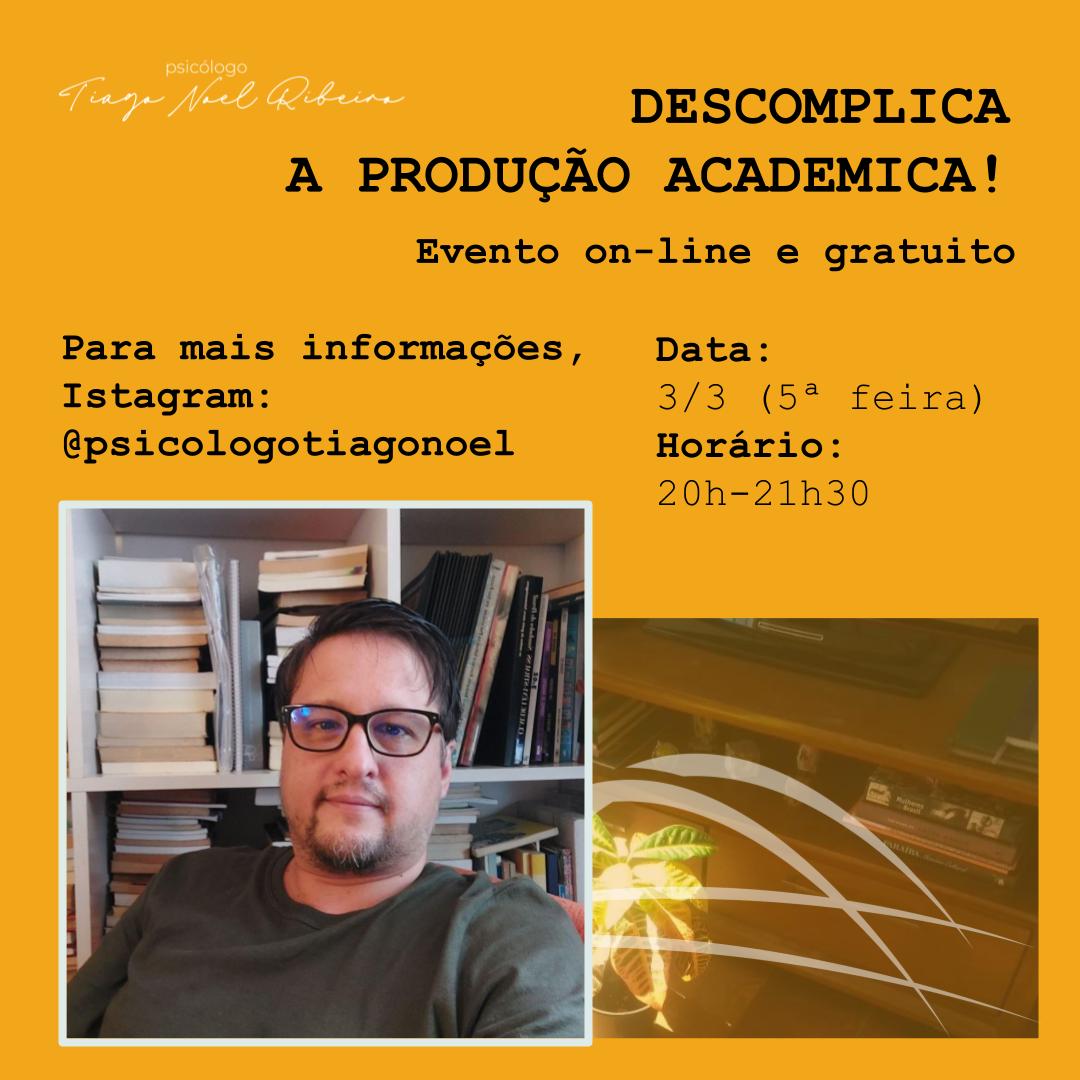 Formado em Psicologia pela PUC-SP, Tiago Noel Ribeiro realiza evento online e gratuito para discutir dificuldades e soluções dos alunos de graduação e pós-graduação na produção de suas pesquisas. A atividade acontece dia 3/3, entre 20h e 21h30, via Zoom.