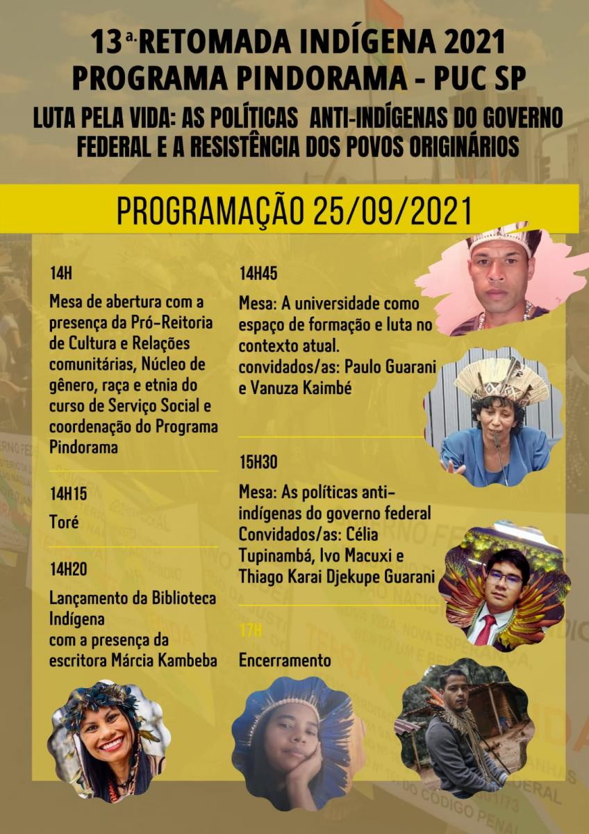 No próximo dia 25/9, às 14h, se realiza a 13ª Retomada Indígena, organizado pelo Programa Pindorama, com apoio do Núcleo de Gênero, Raça e Etnia do curso de Serviço Social e da Pró-Reitoria de Cultura e Relações Comunitárias.