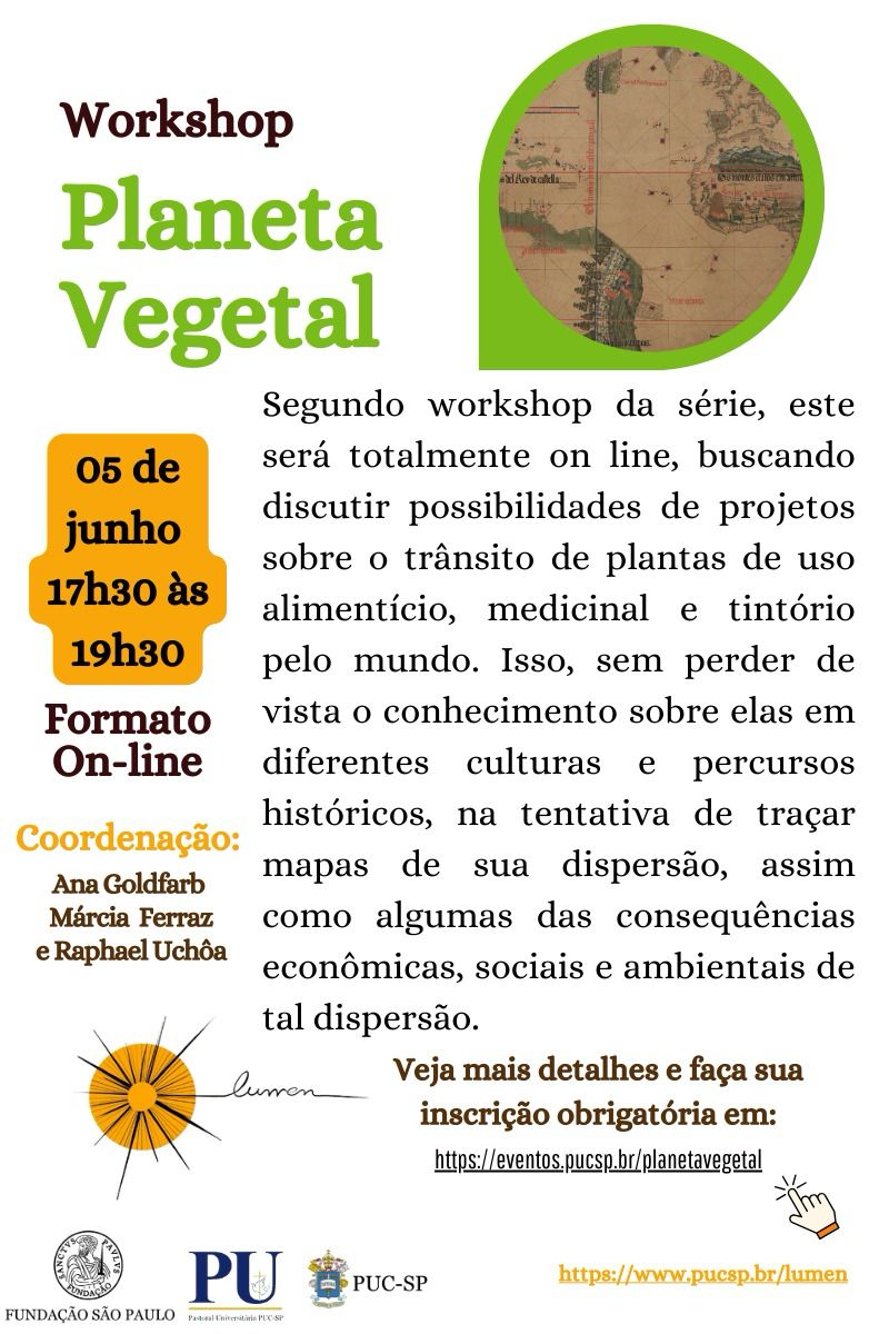 Dia 5/6, às 17h30, acontece o segundo workshop online da série Planeta Vegetal, que discute possibilidades de projetos sobre o trânsito de plantas de uso alimentício, medicinal e tintório pelo mundo. A coordenação é das profas. Ana M. Alfonso-Goldfarb, Márcia Ferraz e Raphael Uchoa. Promoção: Lumen.