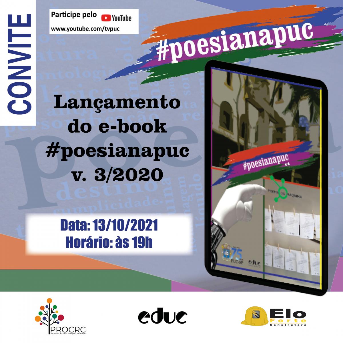 No dia 13/10, às 19h, será realizado o lançamento do e-book #poesianapuc v. 3/2020, que reúne os melhores poemas escritos por membros da comunidade acadêmica. Na edição do ano passado, os textos de três mulheres foram premiados por terem recebido o maior número de curtidas no site: os poemas das alunas Alberta Goes e Beatriz Badim de Campos e de Alessandra Schmidt Gonzalez, na categoria amiga da PUC-SP.