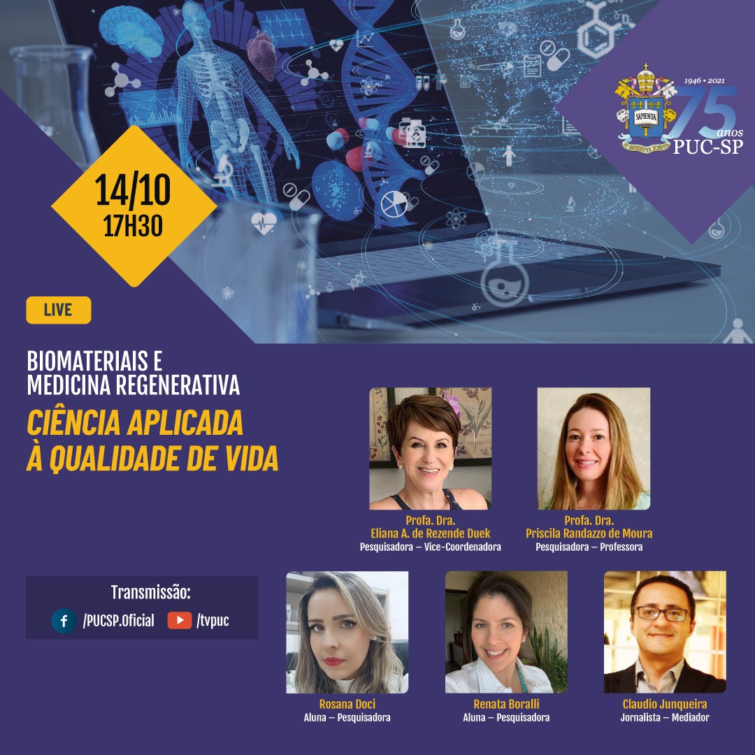 Dia 14/10, às 17h30, o Pós em Biomateriais e Medicina Regenerativa realiza a live Ciência aplicada a qualidade de vida. O evento será transmitido pelo facebook oficia da PUC-SP e pelo youtube da TV PUC.