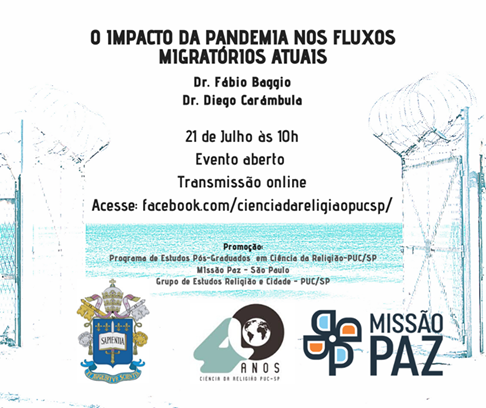 O Pós em Ciência da Religião realiza, via Facebook do programa, nesta terça-feira (21/7) às 10h, o evento aberto "O Impacto da Pandemia nos Fluxos Migratórios Atuais". Veja na imagem como participar.
