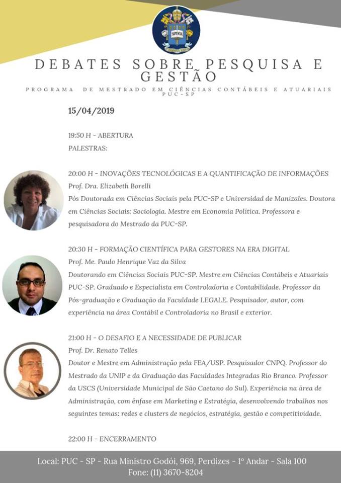O Pós em Ciências Contábeis e Atuariais realizará, no dia 15/4, às 19h50, o evento Debates sobre Pesquisa e Gestão, no campus Monte Alegre, auditório 100 (1º andar, prédio novo). Haverá palestras dos professores Elizabeth Borelli, Paulo Henrique Vaz da Silva e Renato Telles. Confira abaixo a programação.