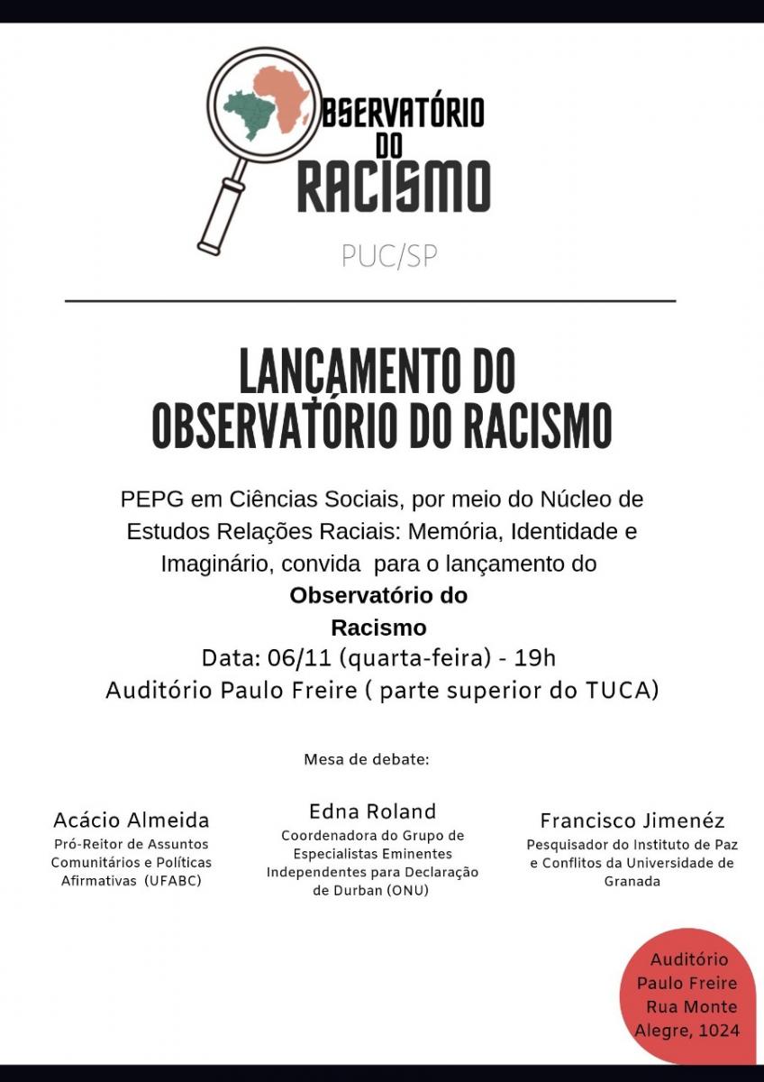 O Pós em Ciências Sociais, por meio do Núcleo de Estudos Relações Raciais: Memória, Identidade e Imaginário, realiza, no dia 6/11, o lançamento do Observatório do Racismo. Participam da atividade o prof. Acácio Almeida (Pró-Reitor de Assuntos Comunitários e Políticas Afirmativas -UFABC), Edna Roland (Coordenadora do Grupo de Especialistas Eminentes Independentes para Declaração de Durban - ONU) e Francisco Jimenéz (Instituto de Paz e Conflitos da Universidade de Granada). O evento acontece no Auditório Paulo Freire - saguão superior do Tuca ( Rua Monte Alegre, 1.024).