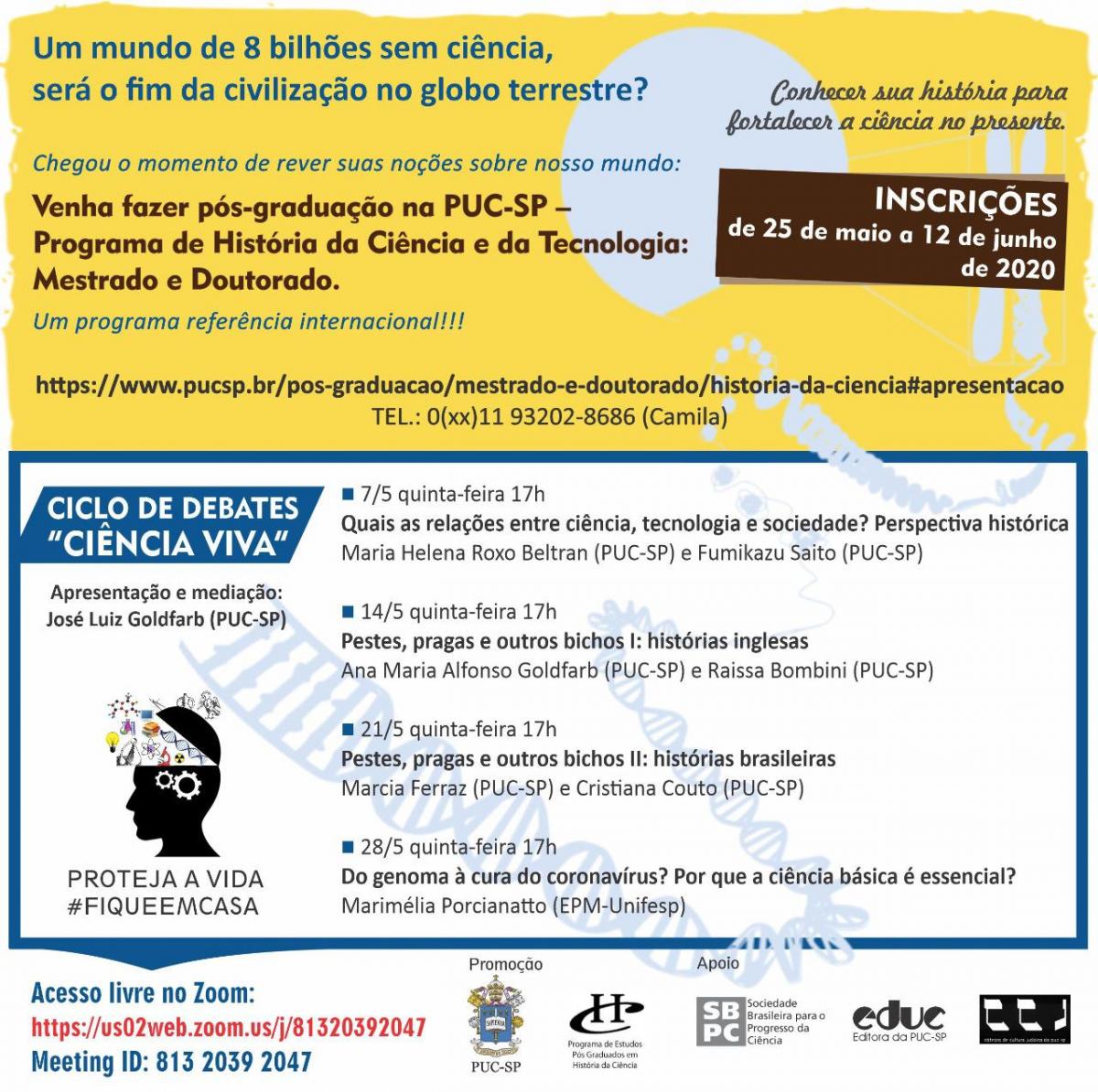 O Pós em História da Ciência realiza a série de debates Ciência viva, a partir de 7/5, com livre acesso pela plataforma Zoom. O primeiro dia do evento também marca a participação do Pós enm História da Ciência na Marcha Virtual pela Ciência, promovida pela SBPC (Sociedade Brasileira para o Progresso da Ciência) e outras entidades.