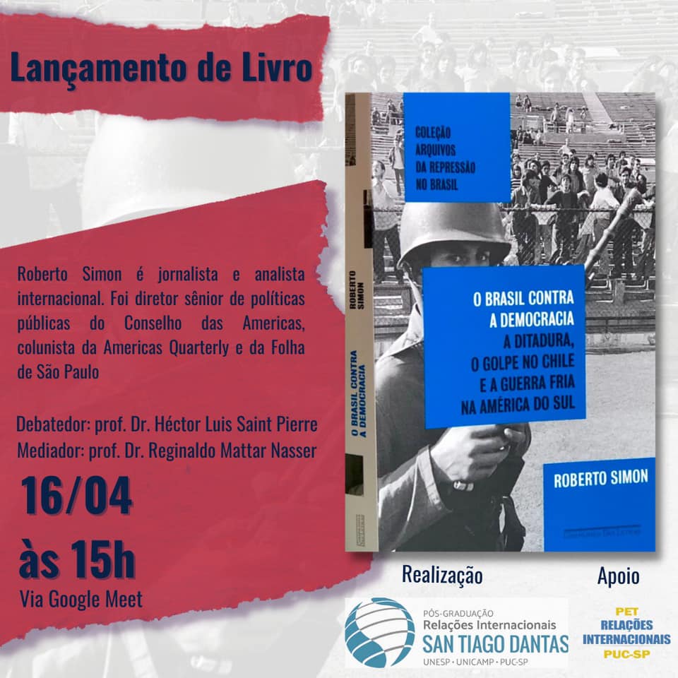 Dia 16/4, às 15h, o Programa de Pós-Graduação em Relações Internacionais Santiago Dantas (UNESP/UNICAMP/PUC-SP) promove o lançamento do livro O Brasil contra a democracia: A ditadura, o golpe no Chile e a Guerra Fria na América do Sul.