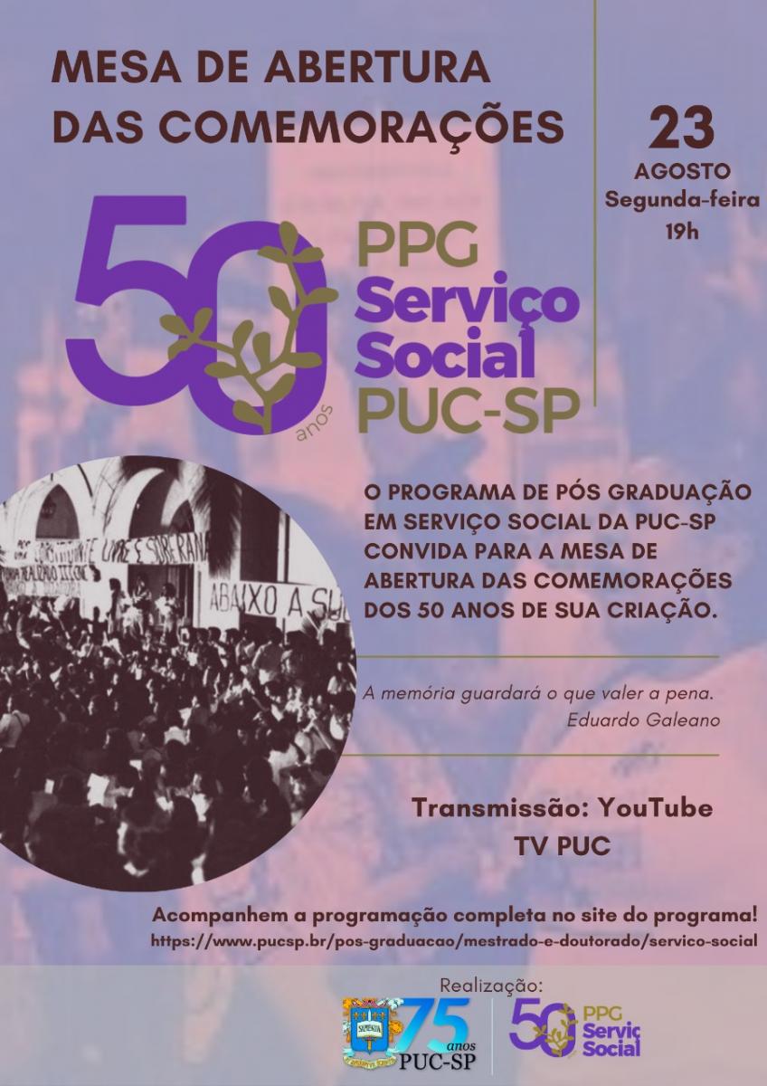 O Pós em Serviço Social dá início neste dia 23/8, às 19h, às comemorações de seus 50 anos.