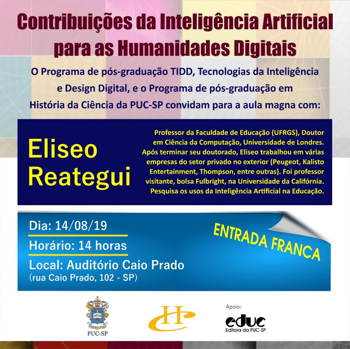 No dia 14/8 (quarta-feira), às 14h, o Pós em TIDD (Tecnologias da Inteligência e Design Digital) e o Pós em História da Ciência realizam a aula magna "Contribuições da Inteligência Artificial para as Humanidades Digitais", no campus Marquês de Paranaguá, com o profº Eliseo Reategui (UFRGS)