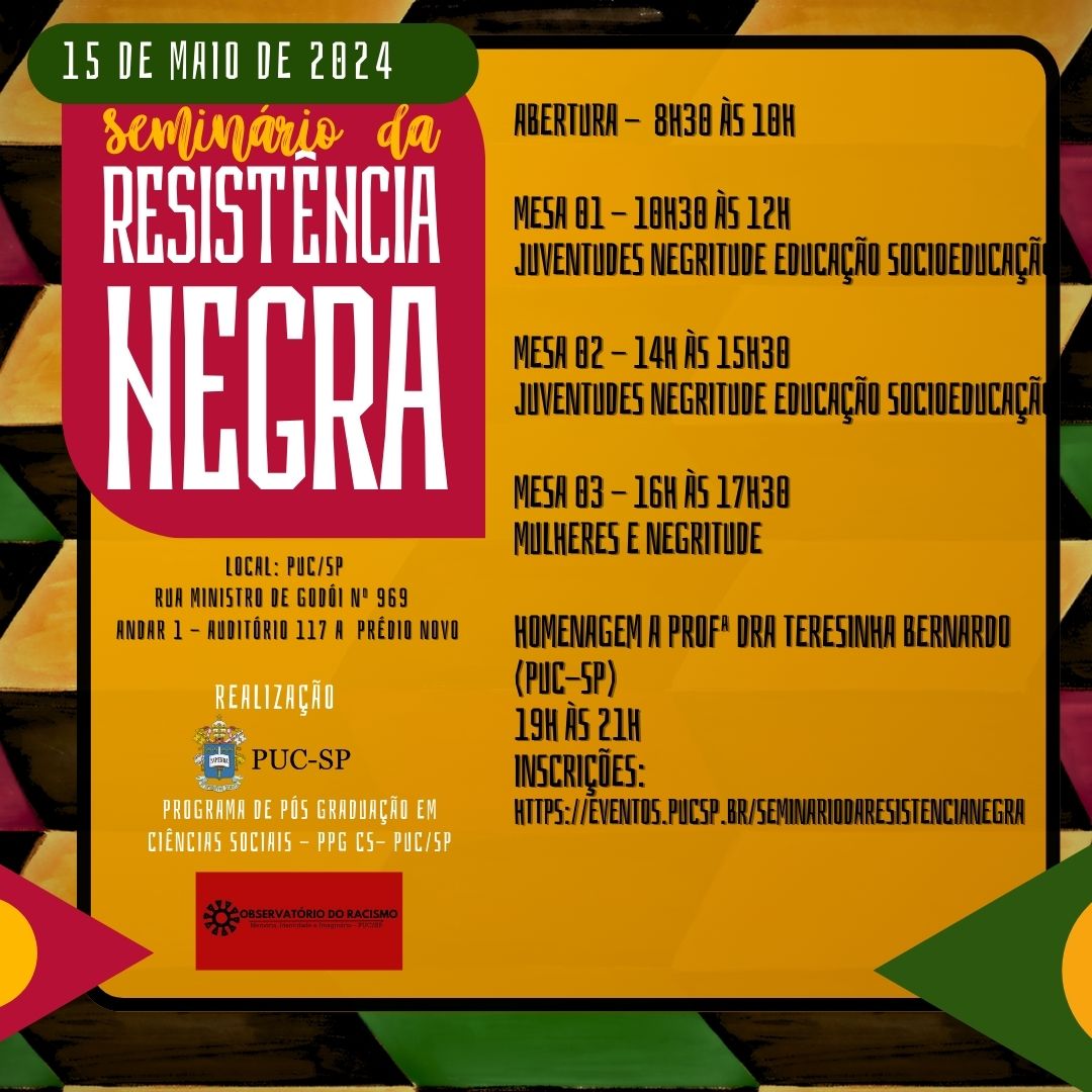 O Programa de Pós-Graduação em Ciências Sociais promove o evento Seminário da Resistência Negra. A atividade acontece nos dias 15 e 16/5, das 8h30 às 20h, no auditório 117A do campus Monte Alegre. Clique aqui e inscreva-se.