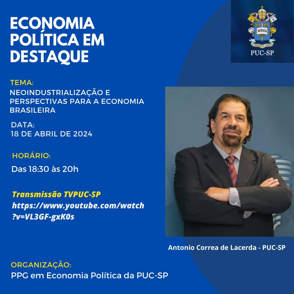 O Programa de Pós-Graduação em Economia Política da PUC-SP promove o evento Neoindustrialização e perspectivas para a economia brasileira, com o prof. Antônio Correa de Lacerda.