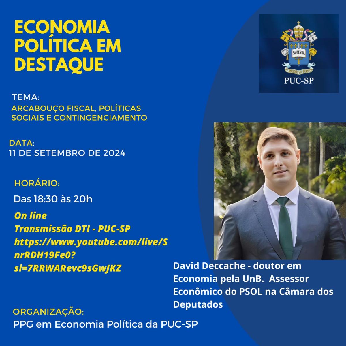 O Programa de Pós-Graduação em Economia Política da PUC-SP promove a palestra Arcabouço fiscal, políticas sociais e contingenciamento. A atividade acontece no dia 11/9, das 18h30 às 20h e contará com transmissão online (clique aqui para assistir).