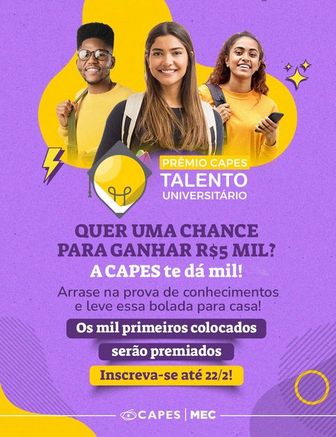Até 22/2, estão abertas as inscrições para o Prêmio CAPES Talento Universitário, que vai gratificar financeiramente os alunos que alcançarem as melhores notas em uma prova de conhecimentos gerais, que será aplicada em todo o País, no dia 26/3.
