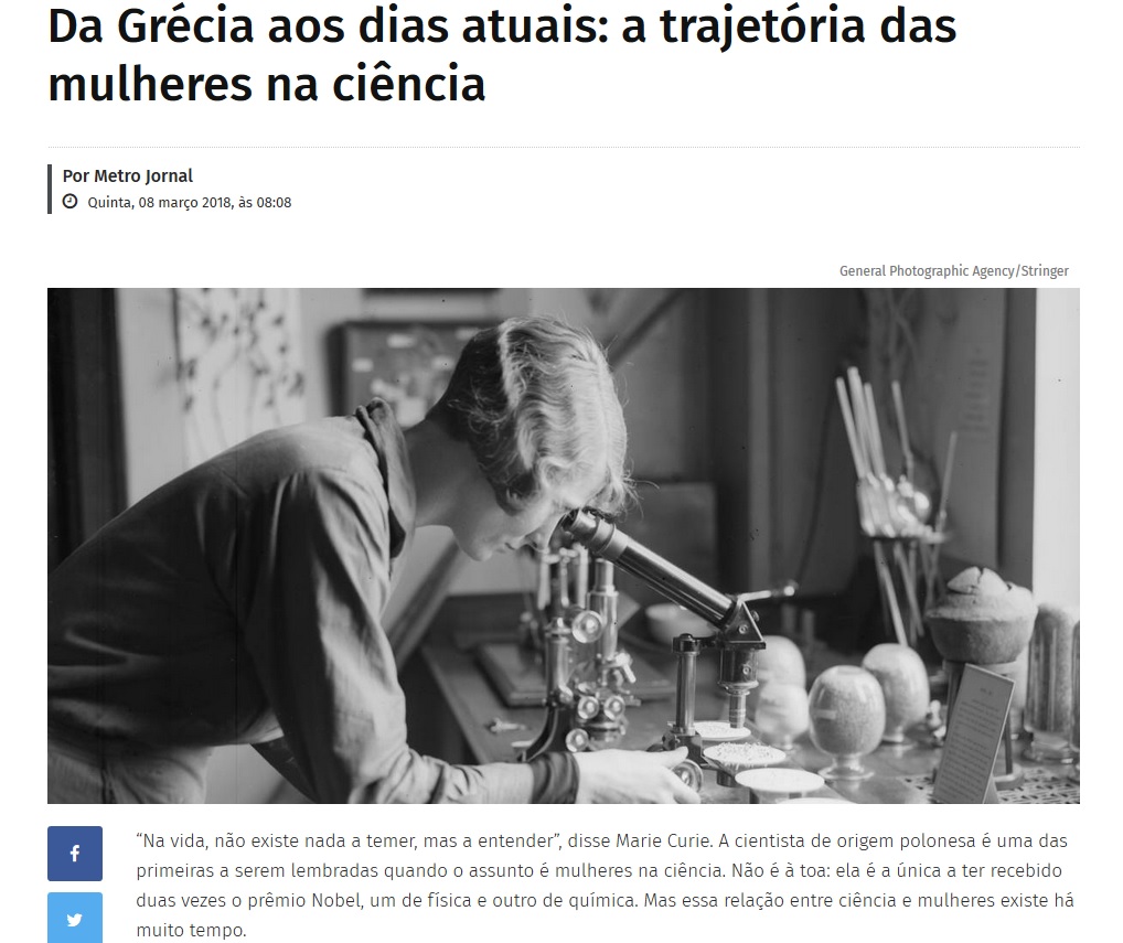 O prof. José Luiz Goldfarb (Pós em História da Ciência e Educ) participou de reportagem do jornal Metro sobre a presença das mulheres na ciência ao longo da história. Clique aqui e leia a matéria completa.