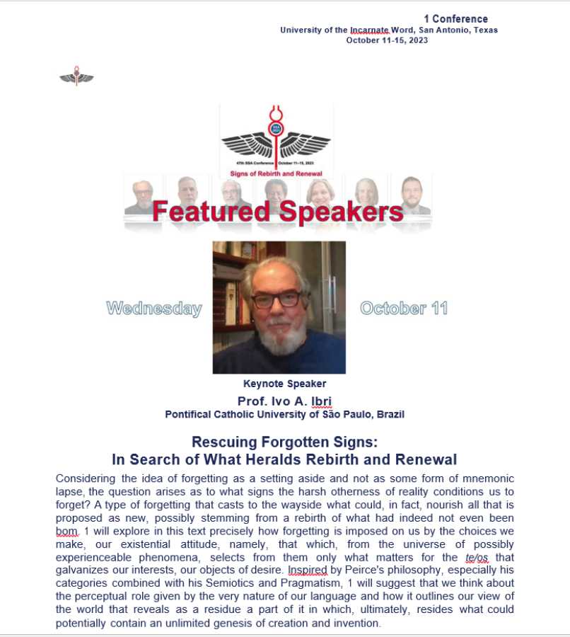 O prof. Ivo Ibri (Pós em Filosofia e Comunicação e Semiótica) abrirá como keynote speaker o 47º congresso da Semiotic Society of America que se realizará em San Antonio, Texas, EUA, entre os dias 11 e 15/10.