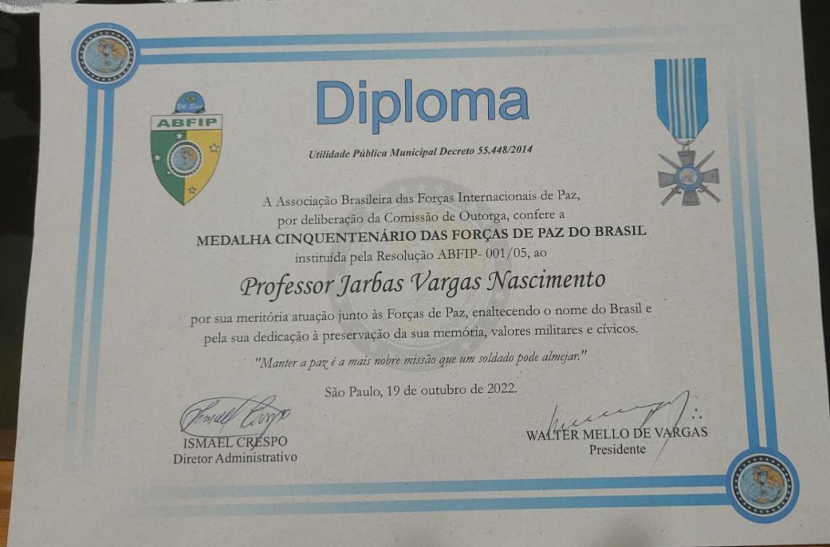 Em outubro, o prof. Jarbas recebeu a medalha Cinquentenário das Forças de Paz do Brasil. Confira: