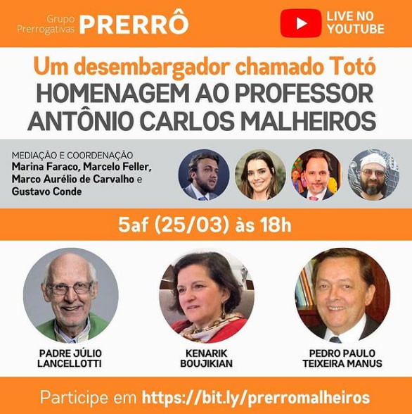 Um desembargador chamado Totó é a homenagens ao professor, a ser realizada pelo Grupo Prerrogativas, dia 25/3, às 18h. Veja abaixo as informações e clique aqui para participar. Haverá participação do prof. Pedro Paulo Teixeira Manus, vice-reitor da PUC-SP; de Kenarik Boujikian, desembargadora aposentada do TJSP, e do Padre Júlio Lancellotti, da Paróquia São Miguel Arcanjo, contando sobre sua luta diária pelos direitos humanos como magistrado, professor e voluntário.
