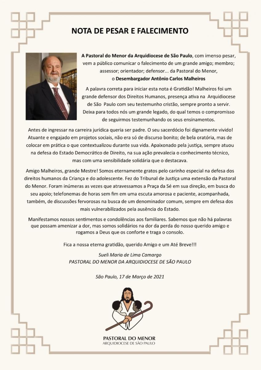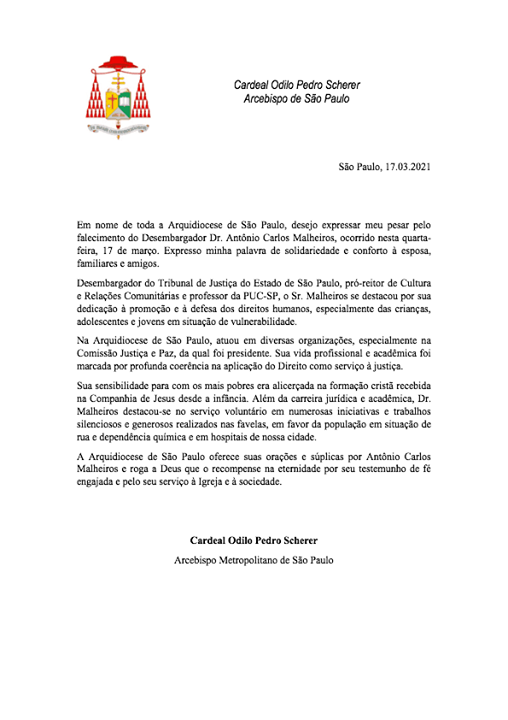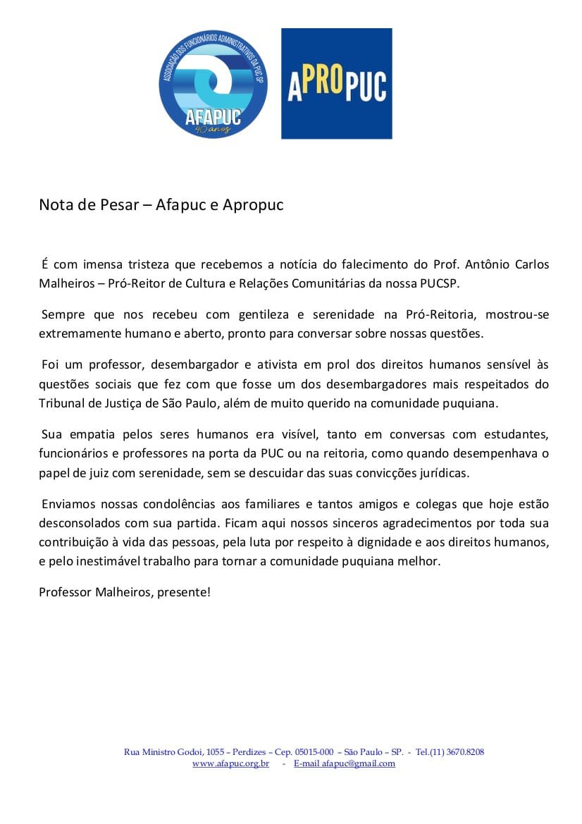 Diversos veículos de imprensa, associações, grupos e entidades lamentaram a morte do prof. Antonio Carlos Malheiros, vitima de um câncer, ocorrida em 17/3. Todos destacavam não somente suas trajetórias acadêmica e juridica, como também o humanismo que caracterizou sua atuações ao longo da vida.