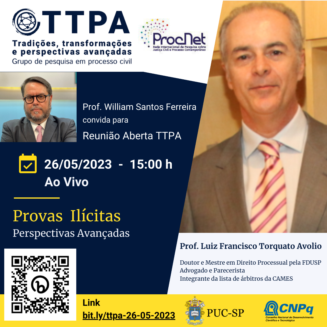 No dia 26/5, às 15h, o prof. William Santos Ferreira (Direito), líder do Grupo de Pesquisa “Processo Civil: Tradições, transformações e perspectivas avançadas - TTPA”, recebe em reunião aberta o prof. Dr. Luiz Francisco Torquato Avolio (USP). O tema do encontro será “Provas Ilícitas – Diálogos Necessários”.