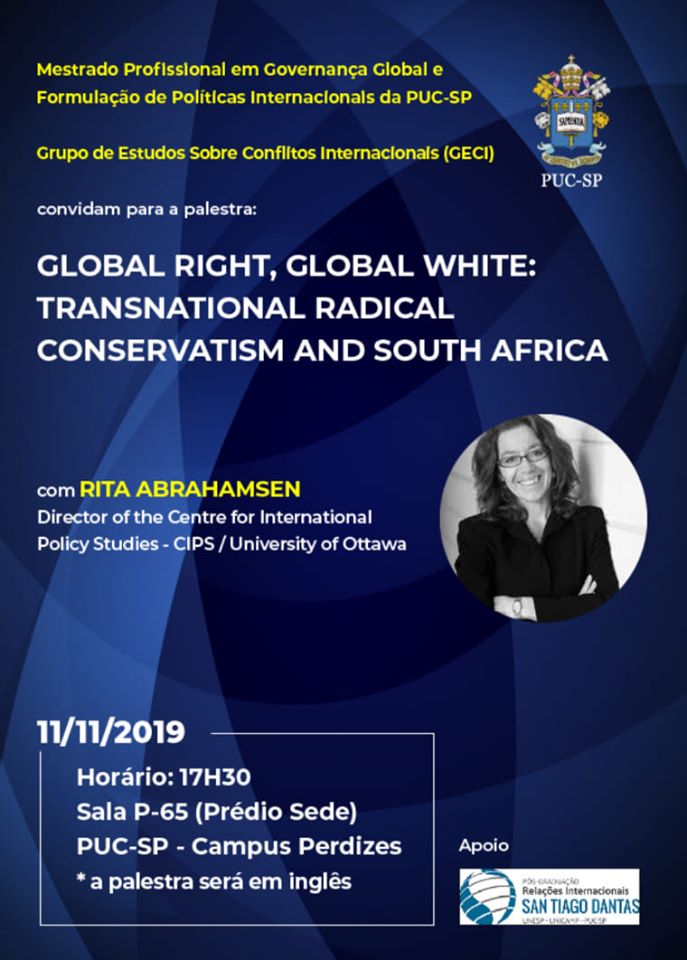 Dia 11/11, às 17h30, a PUC-SP recebe a profa. Rita Abrahamsen da Universidade de Ottawa, com apoio do Programa San Tiago Dantas de RI e do SimpoRI. A palestra Global Right, Global White: transnational radical conservatism and South Africa será realizada em inglês, no campus Monte Alegre, auditório P-65 (1º andar, prédio velho).