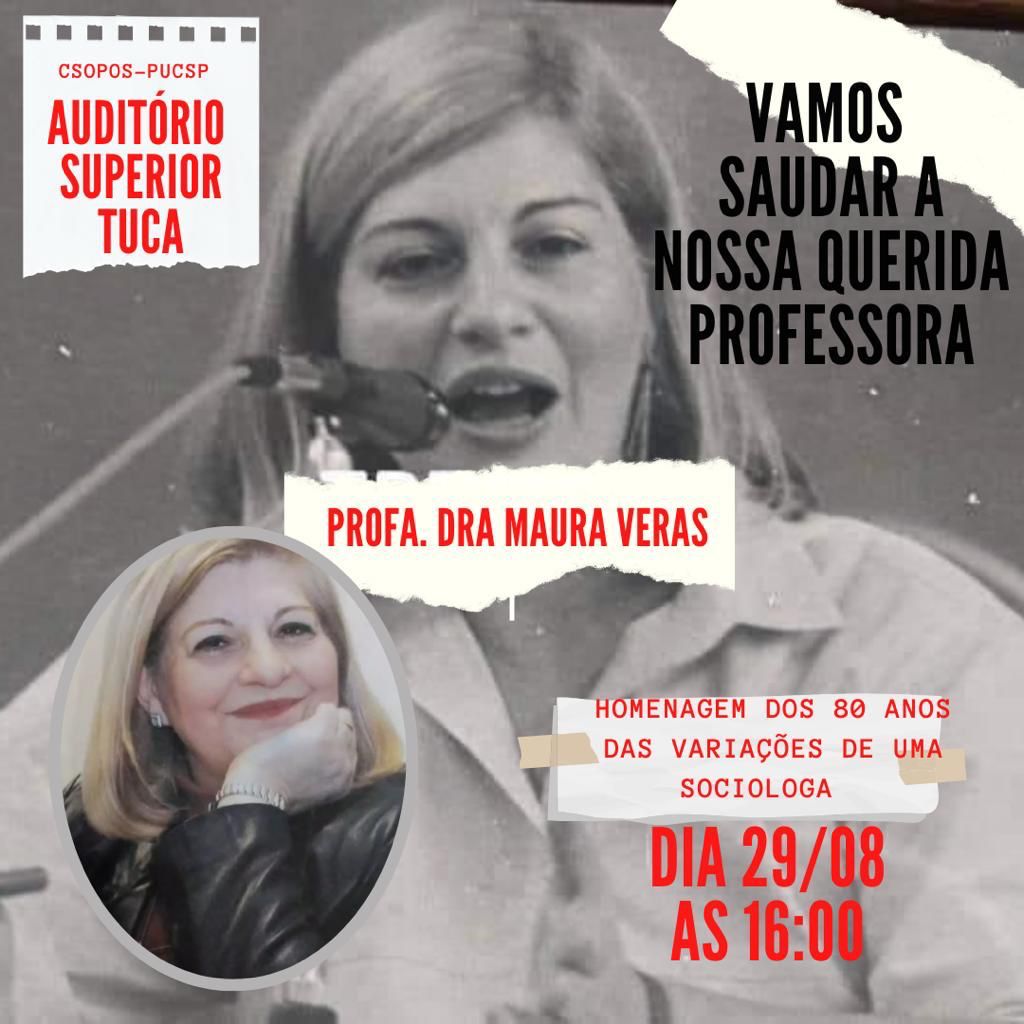“Se você passou pelo Programa de Ciências Sociais da PUC-SP, sabe quanto a Sociologia Urbana explica o mundo e as cidades, compreende a importância do conceito de Alteridade e generosamente cita teorías de Durkheim, Marx e Weber de trás para frente (ou quase isso), segue convite para celebrarmos juntas, juntas e juntes os 80 anos de nossa querida professora Maura Pardini Bicudo Véras”, afirmam os organizadores da homenagem: Suzane Caroline Gil Furtuoso, Ana Júlia Fernandes Braga Borges, Ester Bae, Maria Eduarda Congentino Carneiro, José Paulo Ramos dos Santos, Márcio Valério Effgen e Maíra Ribeiro de Assis Bastos.