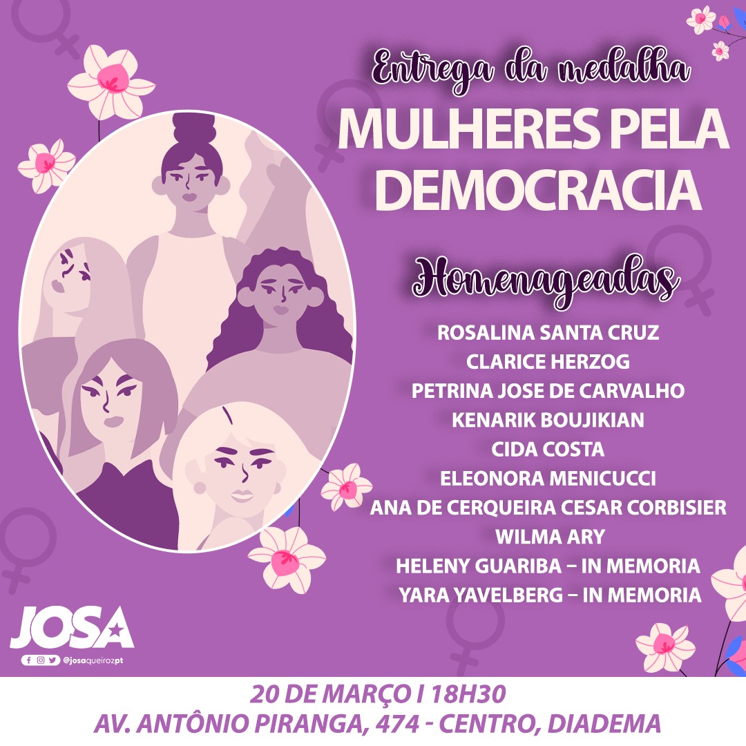 A profa. Rosalina Santa Cruz (Serviço Social) será uma das agraciadas com a medalha Mulheres pela democracia, que será entregue dia 20/3, às 18h30, em Diadema (Grande São Paulo).
