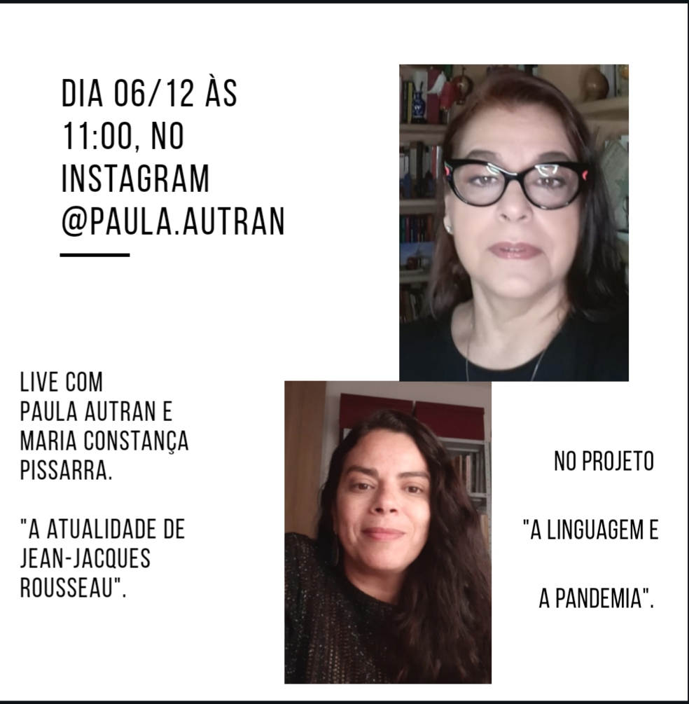 A professora Maria Constança Pissarra (Depto. Filosofia) e a ex-aluna Paula Autran farão uma live no dia 6/12, às 11h, com o tema "A atualidade de Jean-Jacques Rousseau". A transmissão online integra o projeto "A Linguagem e a Pandemia" e será realizada no perfil @paula.autran no Instagram.