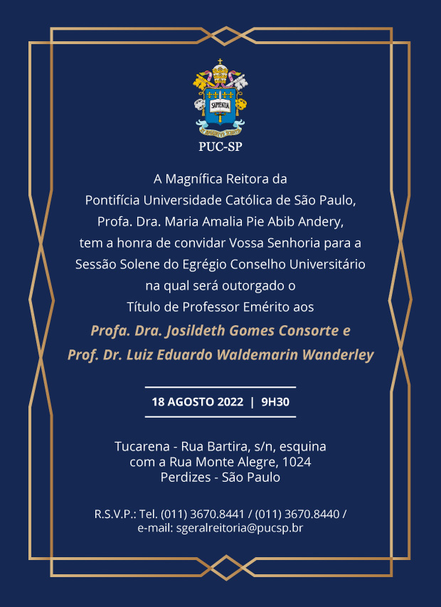 Josildeth Gomes Consorte e Luiz Eduardo Waldemarin Wanderley serão, a partir de 18/8, professores eméritos da PUC-SP. A honraria solicitada pelos docentes do departamento de Ciências Sociais é outorgada pelo Conselho Universitário (Consun) e celebra trajetórias que vão muito além de realizações e conquistas acadêmicas individuais. É o reconhecimento da PUC-SP à importância de ambos para a construção da história da pesquisa científica na Universidade e no Brasil, e a celebração de décadas de amizade e afeto oferecidos a centenas de orientandos, alunos e colegas de profissão.