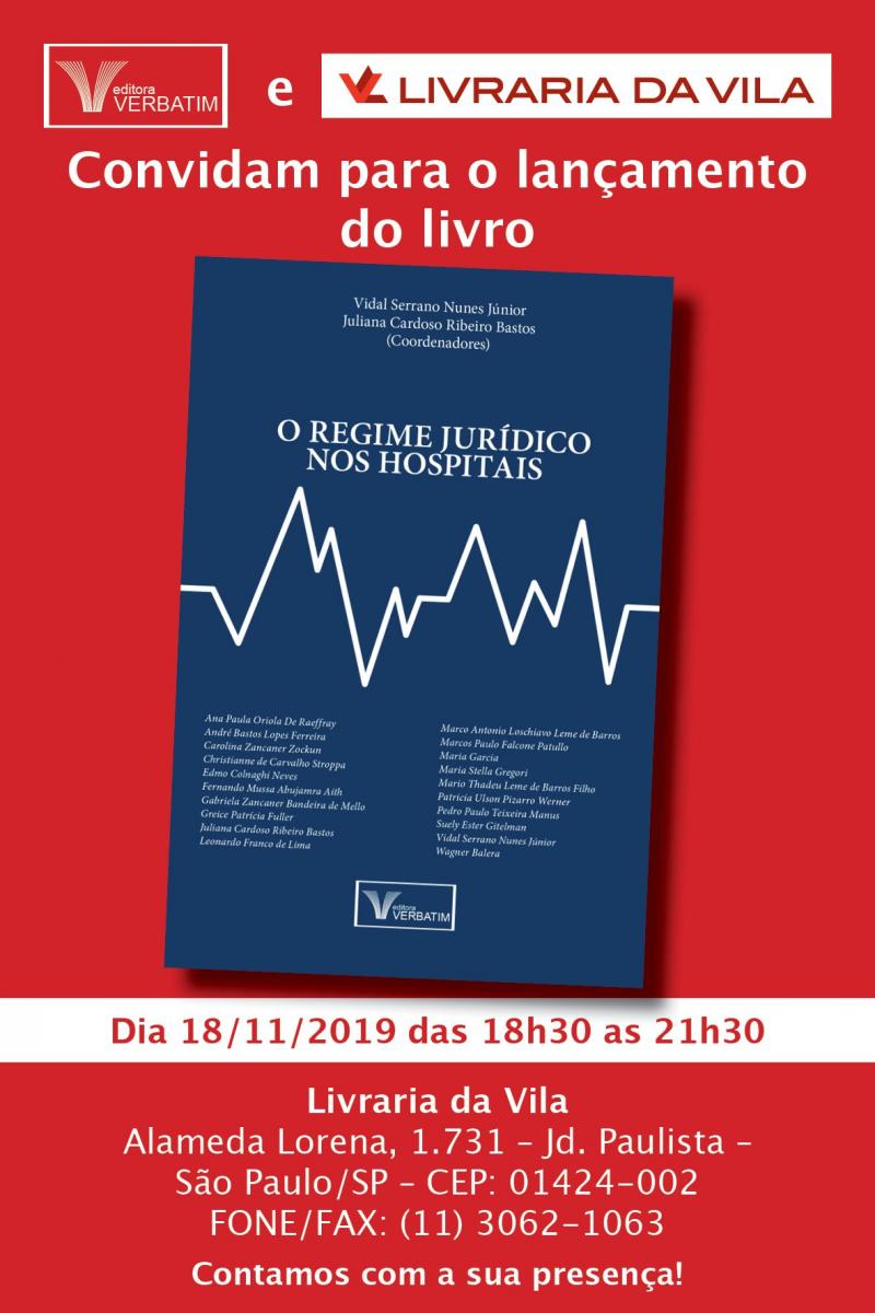 No dia 18/11, às 18h30, acontece o lançamento do livro "O Regime Jurídico nos Hospitais" (Ed. Verbatim), organizado pelos professores Vidal Serrano Nunes e Juliana Cardoso Ribeiro Bastos (Fac. de Direito). O evento será realizado na Livraria da Vila (Al. Lorena, 1,731 - Jd. Paulista). Informações: (11) 3062-1063.