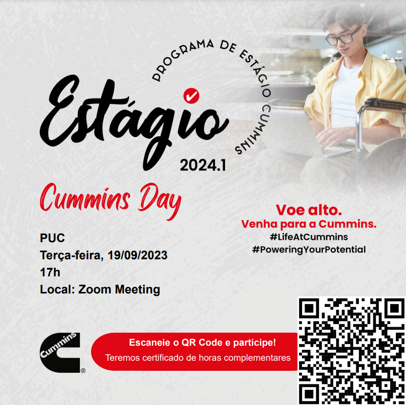 O Setor de Estágios da PUC-SP divulga o webinar Cummins Day, para apresentação do programa de estágios 2024 da empresa Cummins. A atividade é aberta a alunos das diversas formações oferecidas pela PUC-SP.