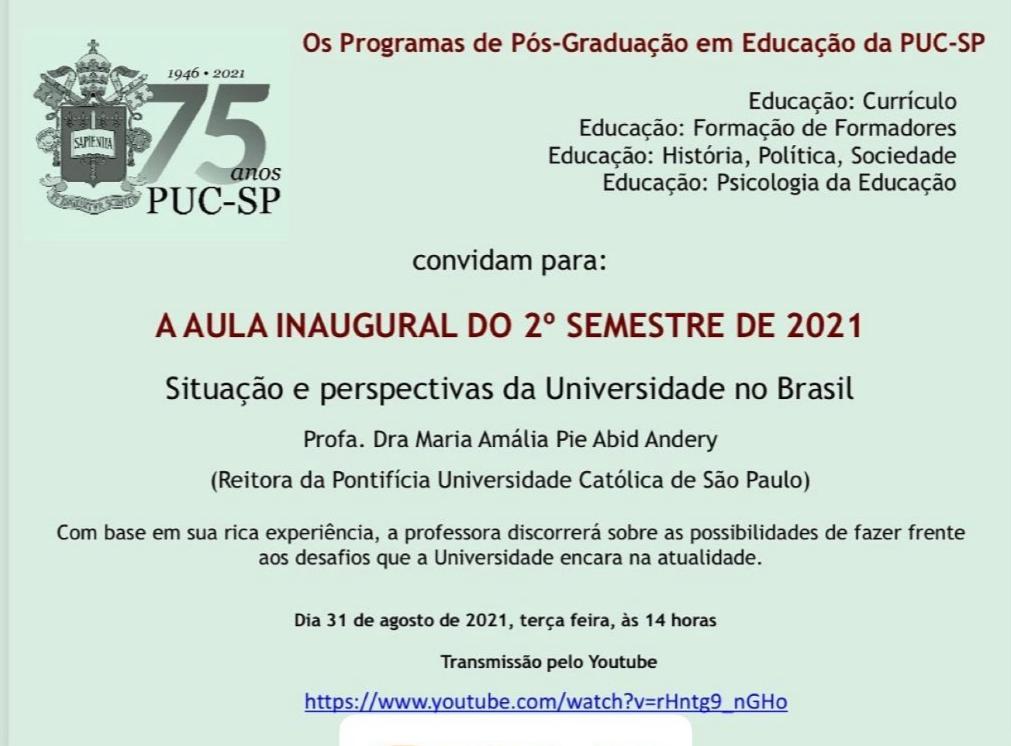 A reitora Maria Amalia Andery participa neste dia 31/8, às 14h, da aula inaugural dos Programa de Pós-Graduação em Educação da PUC-SP. A professora falará sobre o tema Situação e perspectivas da Universidade no Brasil.