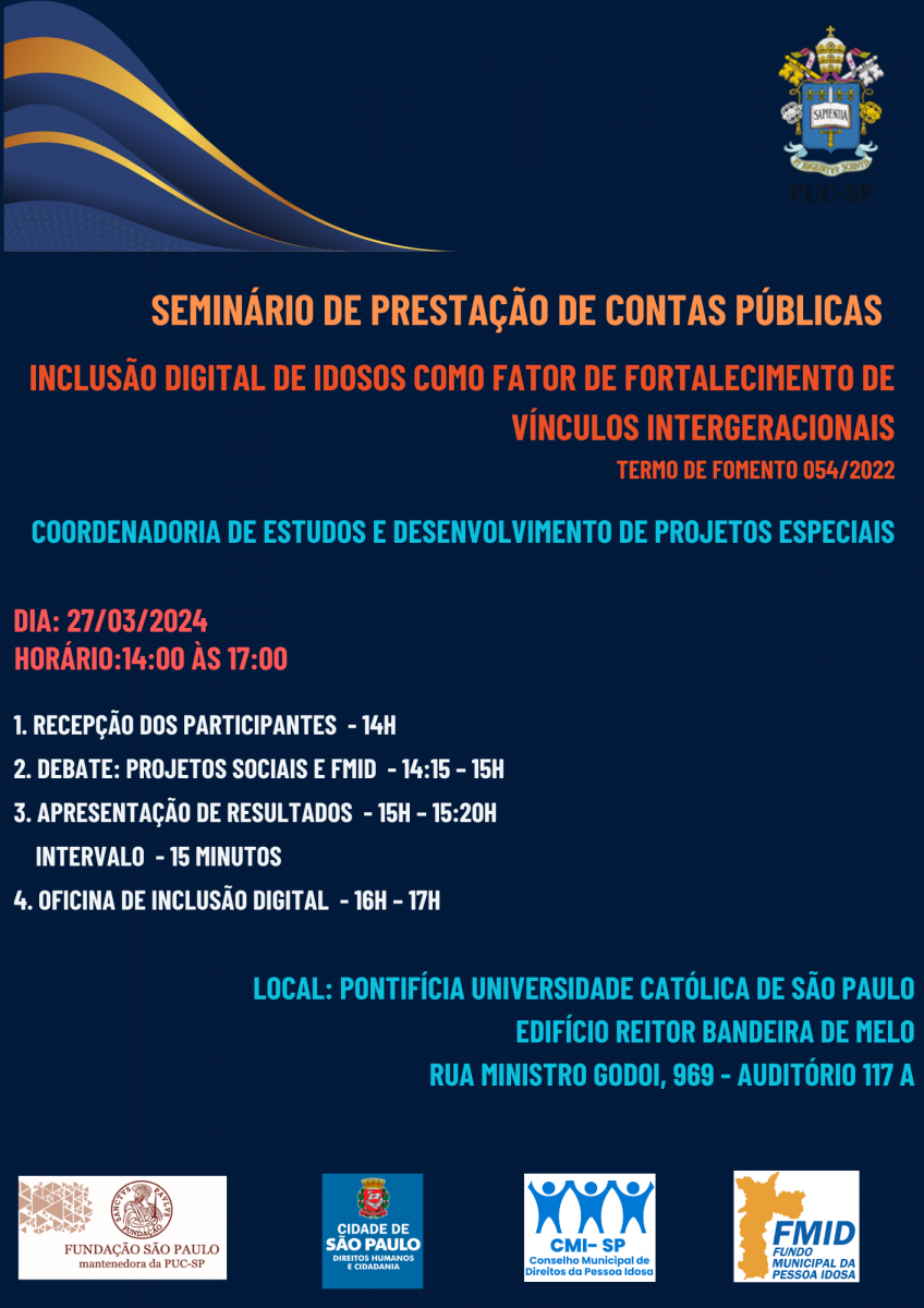 O projeto Inclusão digital de idosos como fator de fortalecimento de vínculo intergerecionais promove um evento no dia 27/3, das 14h às 17h, no Auditório 117 A (prédio novo).
