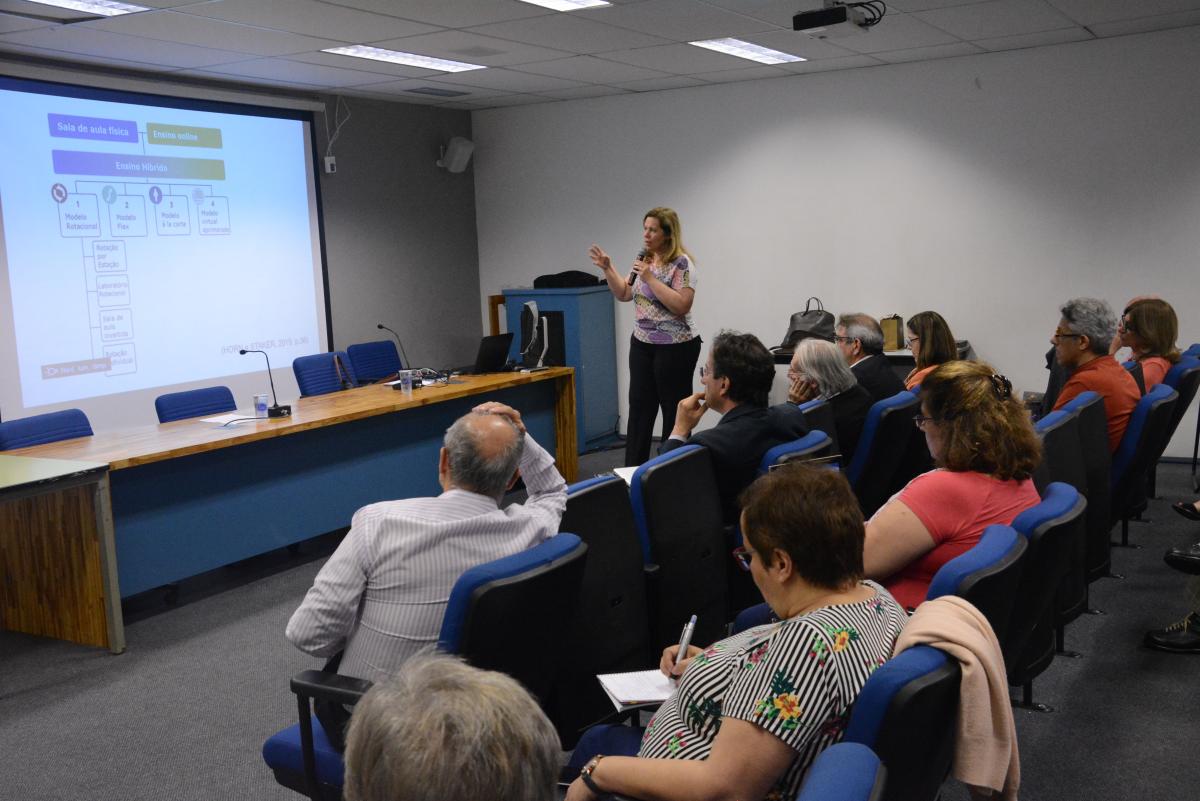 No dia 25.04.18, a Profa. Dra. Lilian Bacich, do Instituto Singularidades, realizou uma conversa com os professores sobre “Potencialidades do Ensino Hibrido”. Esta atividade faz parte de uma série de oficinas para docentes que compõem o Programa de Qualificação da Graduação (Proquali) da Pró-Reitoria de Graduação e do Núcleo Assessor de Tecnologias Educacionais.