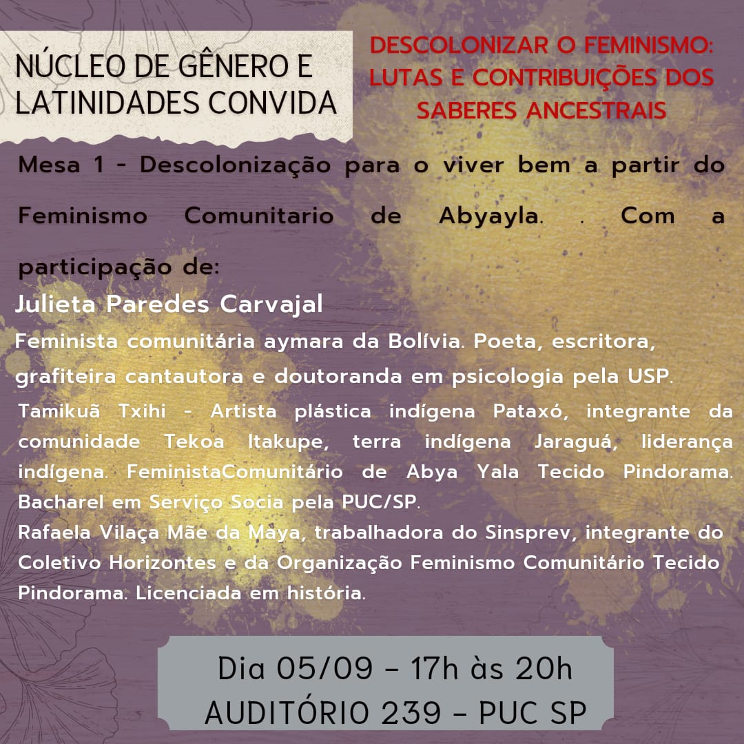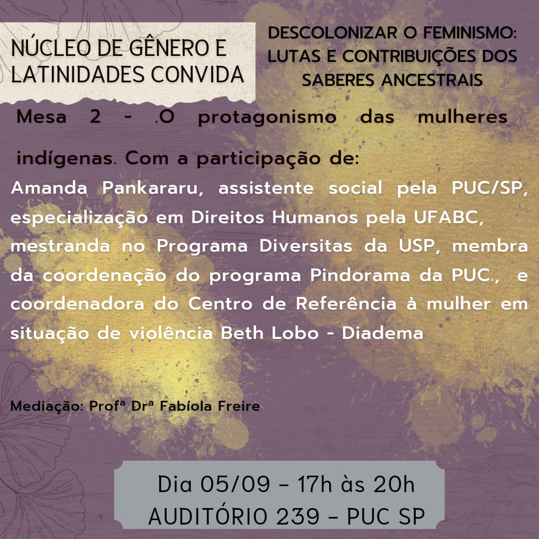No dia 5/9, das 17 às 20h, o Núcleo de Gênero e Latinidades, do curso de Psicologia da PUC-SP, vai realizar uma atividade com a proposta de "Decolonizar o feminismo: lutas e contribuições dos saberes ancestrais", com a presença de lideranças indígenas.