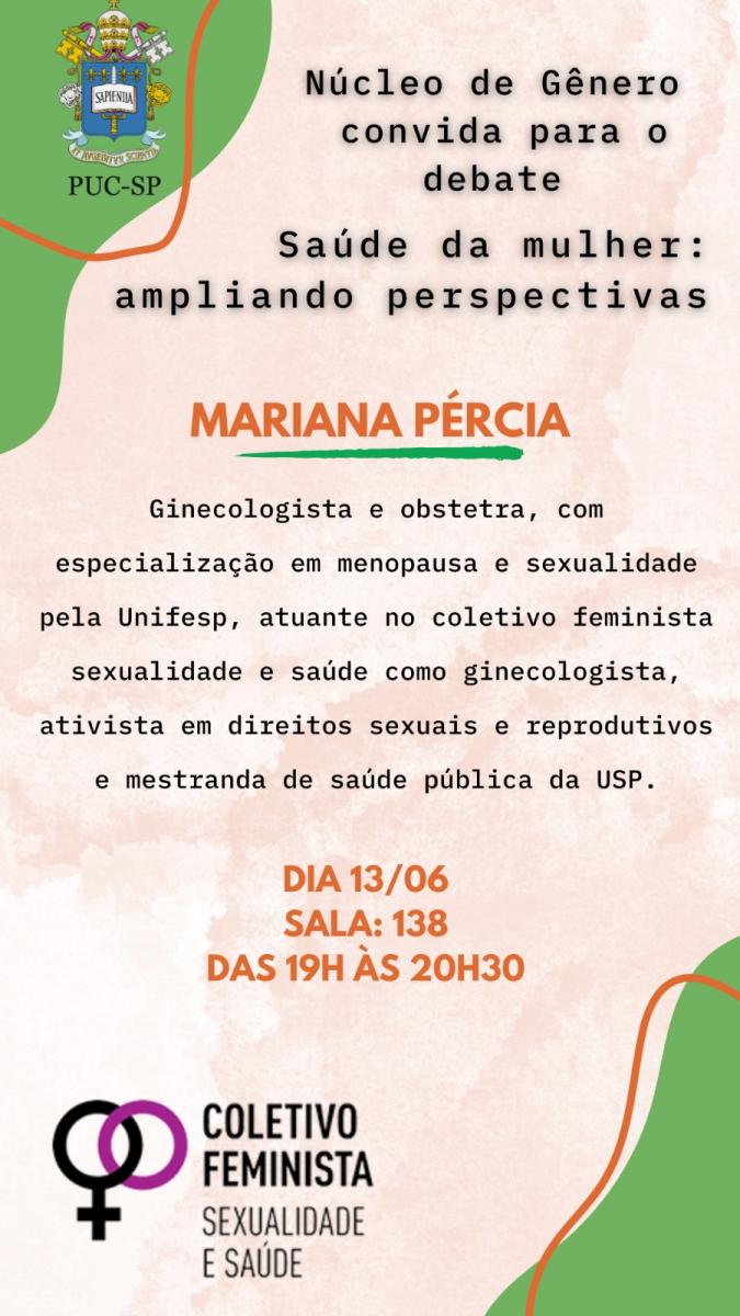 A palestrante Mariana Pércia é ginecologista e obstetra, com especialização em menopausa e sexualidade pela Universidade Federal de São Paulo (Unifesp), mestranda em Saúde Pública na Universidade de São Paulo (USP), atuante no coletivo feminista Sexualidade e Saúde como ginecologista, e ativista em direitos sexuais e reprodutivos.