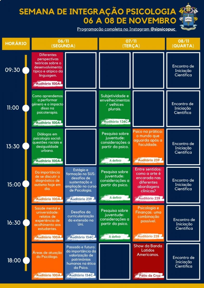 A Semana de Integração é mais um diferencial do curso de Psicologia da PUC-SP. O evento acontece entre os dias 6 e 8/11 no campus Monte Alegre e vai reunir diversas atividades como palestras, mesas de discussão, apresentação de projetos de iniciação cinentífica, sessão de cinema e apresentação musical.